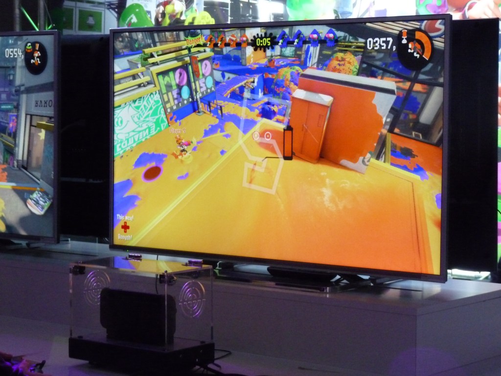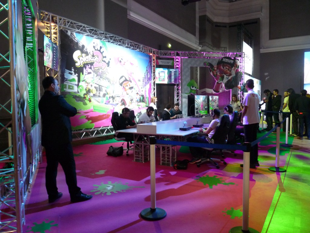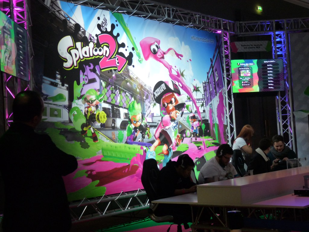 Le stand Splatoon 2 permettait des parties en 4vs4 avec, dans chaque équipe, deux joueurs sur télé avec Pro Controller et deux autres sur la tablette de la Switch.