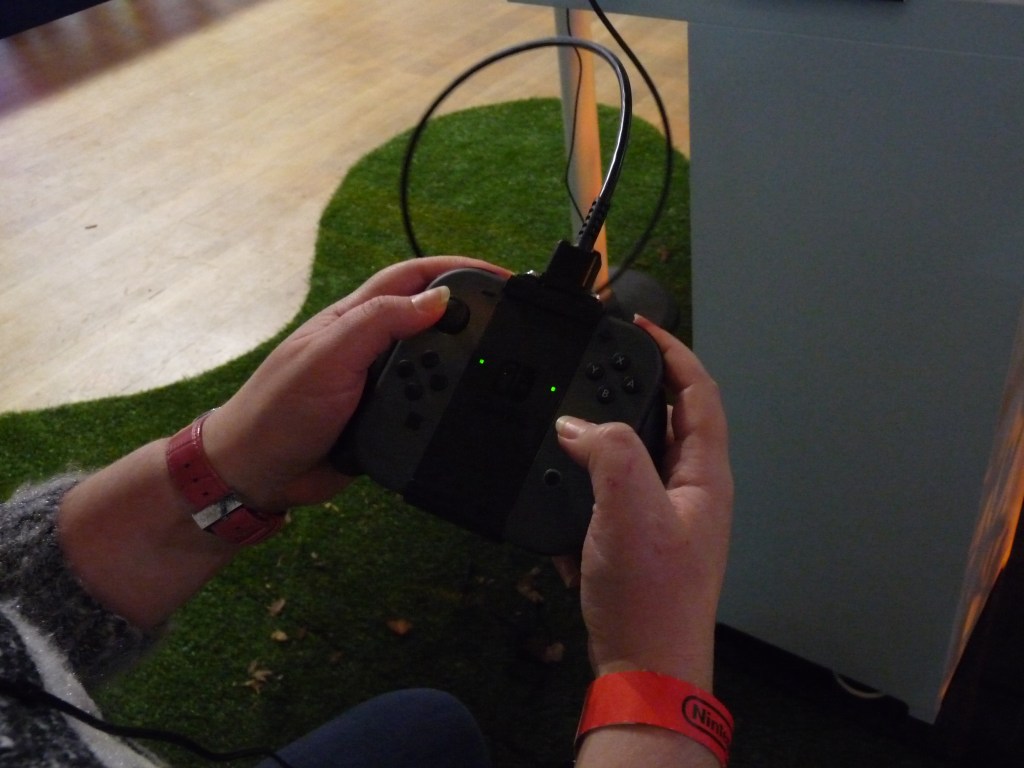 En mode Grip, la manette de la Switch (ici entre les mains de Shayann) se veut très agréable à tenir et l’on se familiarise assez vite avec la façon dont les boutons se répartissent sur sa surface, même si l’emplacement des touches + et – déconcerte au premier abord.