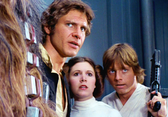 Star Wars – Episode IV : Un Nouvel Espoir, film de science-fiction de George Lucas. Avec Mark Hamill, Carrie Fisher, Harrison Ford, Alec Guinness…