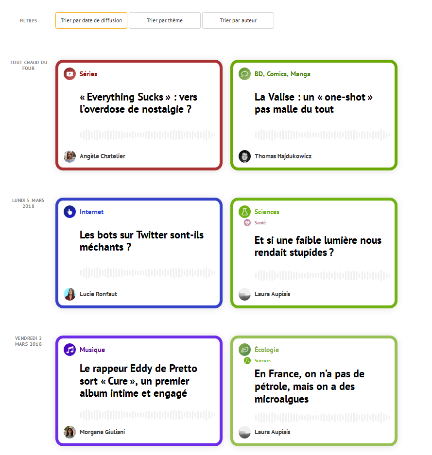 Présenté par Audrey Travère (ex-Les Décodeurs/Le Monde, France Inter, France Bleu Provence…), il est la première incarnation des choix que vous aurez réalisés au préalable. Une dizaine de sujets sont alors abordés, assez rapidement, afin de vous apporter votre petite dose votre d’actualités sur les thèmes qui vous parlent.