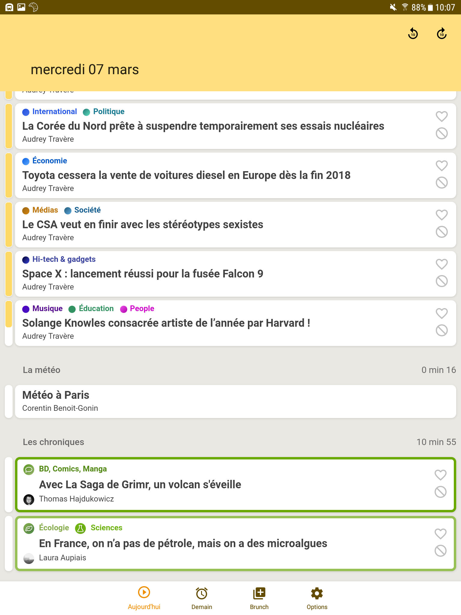 Si vous êtes avides de contenus, l’appli comprend également une section « Brunch » où une tripotée de sujets pas forcément abordés dans votre matinale du jour vous attendent pour toujours plus de chroniques. Le mieux dans ce Brunch, c’est qu’en plus de vous permettre d’élargir le nombre de chroniques liées à vos thèmes favoris, il vous donne aussi l’opportunité d’entendre parler d’autres choses.
