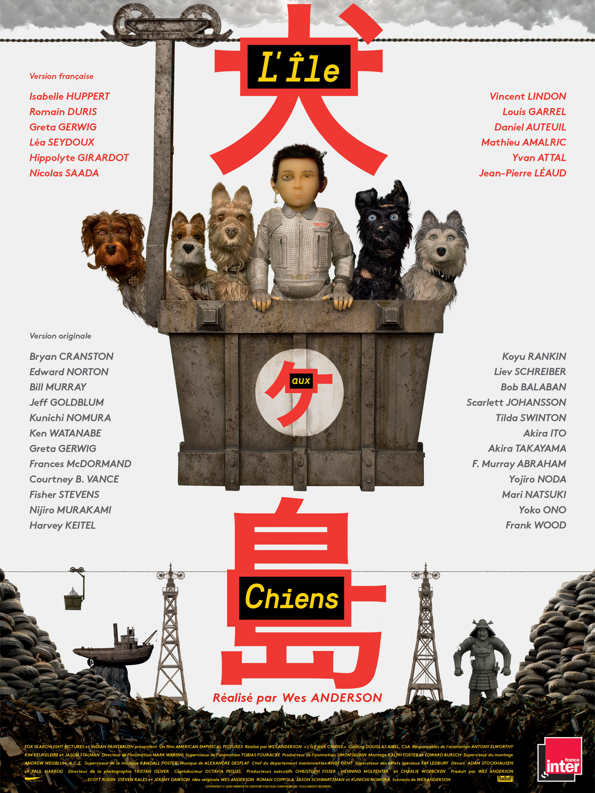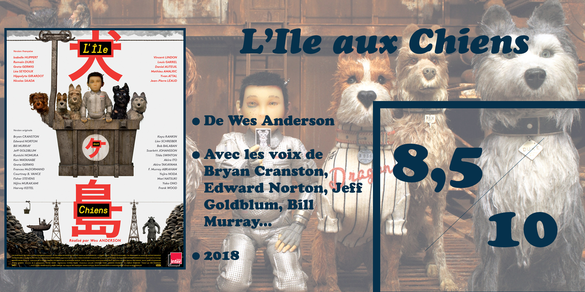 Que dire de plus alors, si ce n’est que le quintet de tête formé par Bryan Cranston, Bill Murray, Bob Balaban, Edward Norton et Jeff Goldblum forme une troupe à lui seul, donnant l’impression que chacun a toujours su jouer avec les autres. Les échanges sont faits avec l’envie de créer une atmosphère de bande, de meute tout bonnement, et le rendu est impeccable. Les cinq acteurs développent ainsi leurs personnages dans la même sphère, imprégnée par un esprit flegmatique aux accents si british qu’on aurait presque imaginé les Monty Python (l’absurdité en moins) incarné ces braves toutous. A leurs côtés, on n’oubliera évidemment pas d’évoquer les prestations d’égale qualité de Greta Gerwig, Scarlett Johansson, Liev Schreiber et, enfin, Koyu Rankin qui prête sa voix au jeune Atari en quête de son chien. Ceci étant dit, je serais très curieux de découvrir le film en VF, Wes Anderson ayant lui-même sélectionné le casting vocal français. Regroupant des comédiens et comédiennes comme Isabelle Huppert, Vincent Lindon, Romain Duris, Mathieu Amalric ou encore Daniel Auteuil, ce cast vocal made in France m’intrigue au point que j’envisage sérieusement de retourner au cinéma pour découvrir L’Ile aux Chiens dans ma langue maternelle. Si j’ai le temps… A noter pour finir là-dessus que Mathieu Amalric et Isabelle Huppert participaient déjà à la VF de Fantastic Mister Fox.