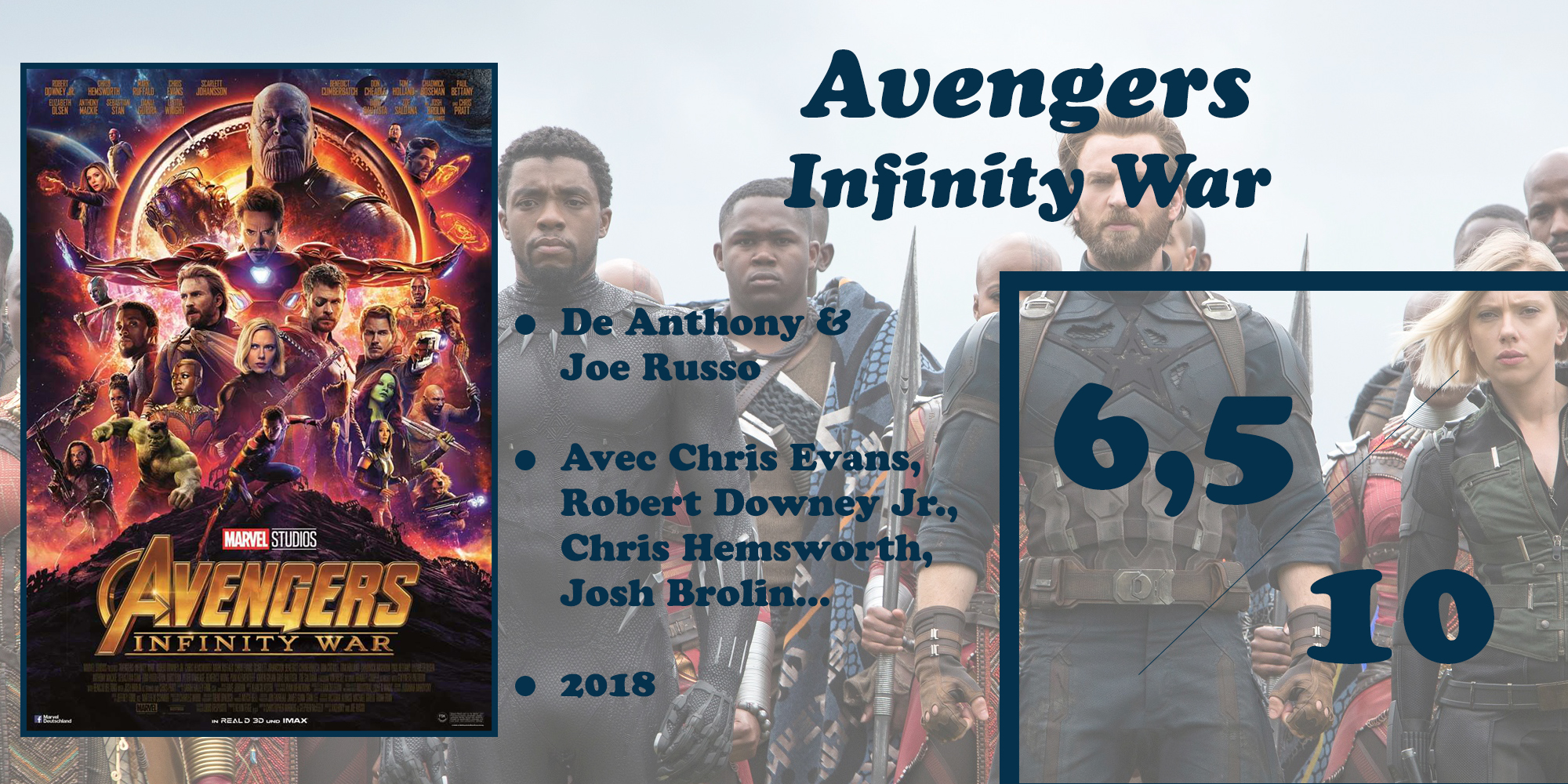 Le pitch : Désunis depuis la signature des Accords de Sokovie (cf. Captain America : Civil War), les Avengers doivent aujourd’hui faire face à la plus grande menace qu’ils aient connue : Thanos (J. Brolin) approche de la Terre pour y récupérer les dernières Pierres d’Infinité. Lorsqu’il aura les six pierres, le titan fou aura un pouvoir suffisamment grand pour exterminer la moitié de la population de l’univers en un claquement de doigts ! Sur différents fronts, les super-héros les plus puissants se rassemblent alors pour empêcher ce massacre annoncé. Mais à quel prix ?