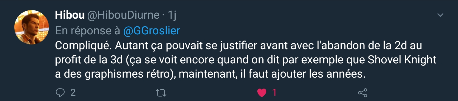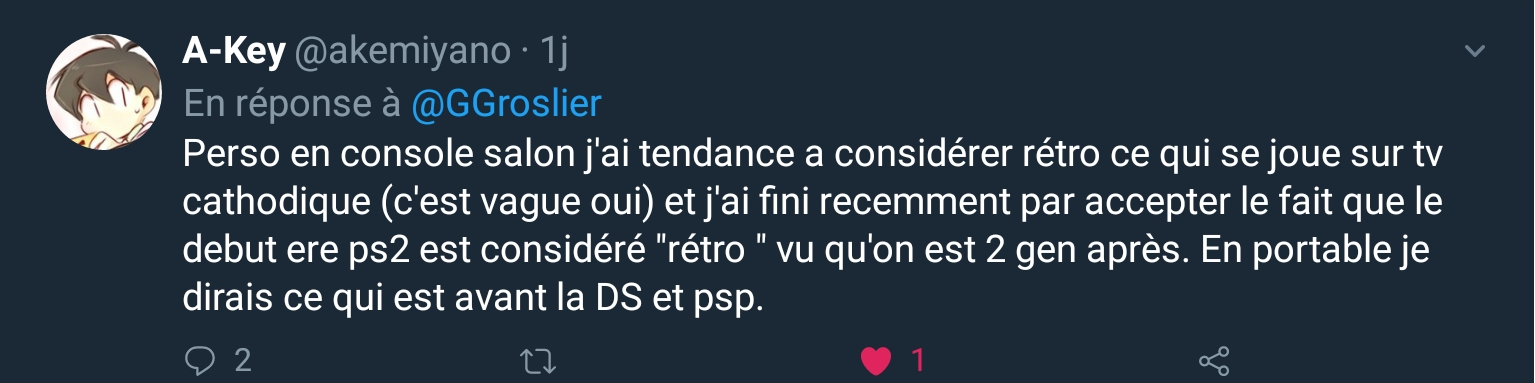 Rétro, c’est un mot qu’on pose sur un ressenti. […] J’ai du mal à considérer la génération HD (PS360) comme rétro. Tout comme la PS2 étrangement qui est tellement restée ancrée encore aujourd’hui alors que la Dreamcast, qui est de la même gen, paraît rétro. Son statut de console morte aide peut-être aussi.