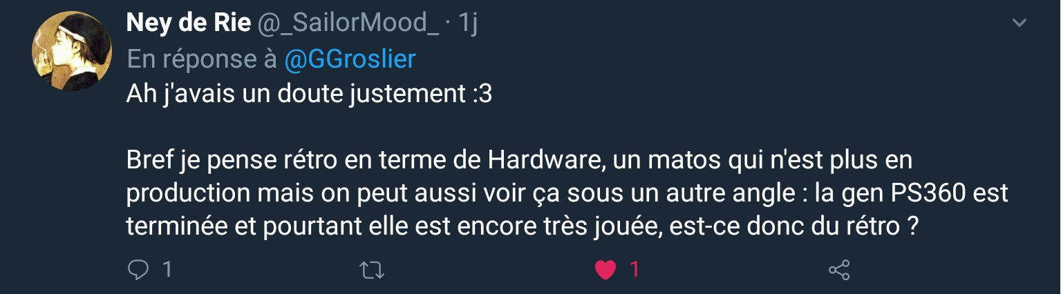 Tout le monde ne sera pas forcément d’accord avec les exemples qu’elle donne mais le point qu’elle soulève demeure pertinent. Ne sachant pas quoi faire des générations terminées mais trop récentes pour avoir un vrai côté rétro, on s’invente une troisième catégorie, sans nom, qui permettrait de couper court au débat par un simple mais efficace : « Ouais non mais c’est pas pareil pour ces consoles-là… ».
