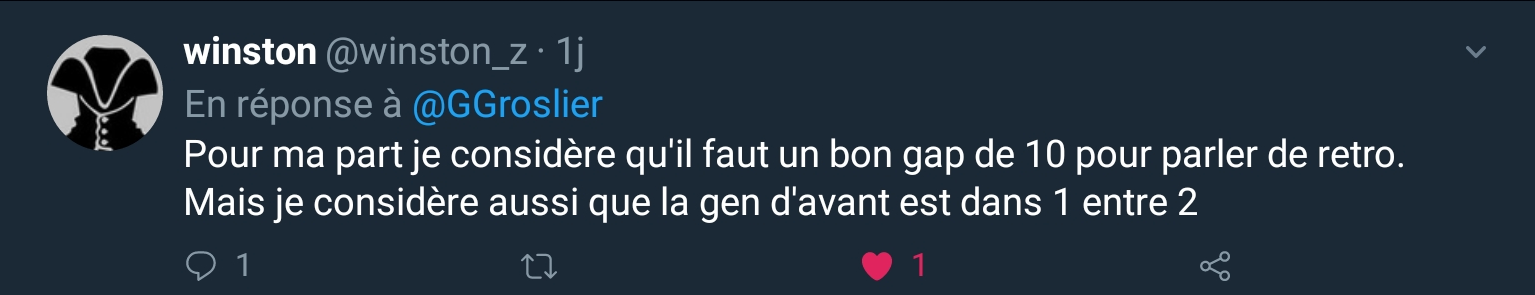 Cette question de définir le rétrogaming, je l’ai posée sur Twitter du coup, histoire de voir ce qu’on en pense parmi mes abonnés. Et quand je demande ainsi à tout un chacun de me donner sa vision propre du jeu rétro, le premier réflexe partagé par le plus grand nombre, c’est de répondre en termes de temporalité, ce qui se fait d’ailleurs de deux manières.