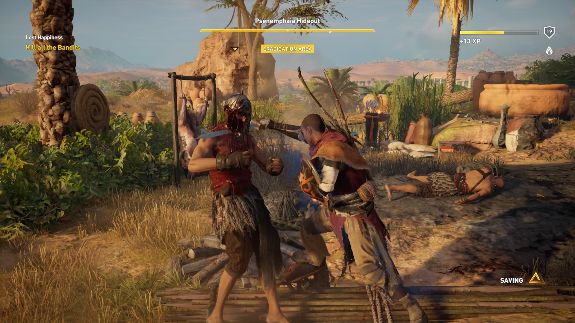Quand on y pense avec le recul, cet ultime épisode de la série ressemble à s’y méprendre à la plupart des jeux AAA d’action-aventure qui font le marché aujourd’hui. Prenant modèle sur certains d’entre eux, Origins fait siennes des mécaniques désormais bien assez éculées et cela se fait non seulement au détriment de son affiliation à Assassin’s Creed mais aussi au prix des défauts dont souffrent ces concurrents plus ou moins directs. Car si ce monde ouvert est somptueux et qu’on prend plaisir à l’explorer, il n’en demeure pas moins qu’il peut parfois s’avérer très pauvre en contenu, les quêtes annexes devenant à la longue assez rébarbatives notamment. Par ailleurs, les principales villes comme Alexandrie ou Memphis ont beau sembler très vivantes par toute la population qui y fourmille, tout cela semble n’être qu’une façade derrière laquelle il n’y a trop rapidement plus grand-chose de franchement intéressant à faire, hélas. Mais on pardonne cette légère faiblesse car ces quêtes en question sont assez bien intégrées dans le décorum général et l’on se surprend parfois à en déclencher une comme si de rien n’était. Cela agacera peut-être ceux qui n’aiment pas faire place à l’imprévu et qui pourraient se sentir contraint mais je préfère y voir quelque chose de généreux, dans le sens où ces quêtes viennent bien plus à moi qu’elles ne le faisaient auparavant. Et si leur contenu est très inégal, il n’en demeure pas moins que j’apprécie grandement voir le soft faire de lui-même preuve d’une certaine volonté en termes de durée de vie, quitte à empêcher la précipitation parfois.