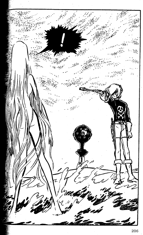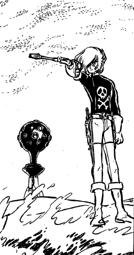 Ce serait dommage d’ailleurs car le travail mené sur le pirate de l’espace est intéressant à plus d’un titre. On pourrait évoquer déjà son apparence, qui le détache grandement du reste des personnages, notamment masculins. L’occasion de souligner par ailleurs qu’aussi cool qu’il puisse être, le dessin peut s’avérer assez inégal selon les planches. Le chara-design reste quant à lui culte, à raison. Mais pour en revenir à Albator lui-même, il est indéniablement à part. Là où les autres hommes de ce manga sont globalement ridicules, petits, gros, avec des visages disgracieux, le capitaine sort du lot : grand, fin, beau, charismatique… Il se dégage de lui un côté hors du commun renforcé également par son côté mystérieux et relativement taiseux et qui contribue pour l’essentiel à la légende (tant dans le manga que dans notre propre sphère littéraire), au mythe du héros que Matsumoto s’emploie à soigneusement construire au fil des pages.