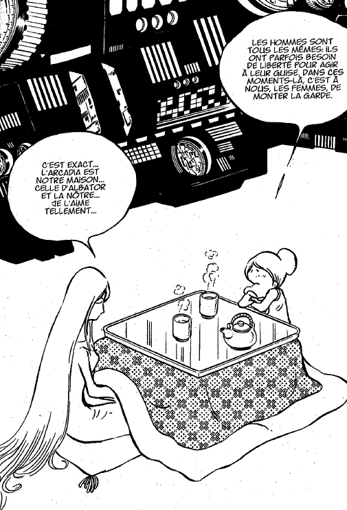 Cela n’enlève cependant rien à certaines critiques que l’on peut formuler à l’égard de cette œuvre de Leiji Matsumoto. Et de celles-ci, je ne retiendrai ici que celle qui pointe du doigt la misogynie dont ce manga peut faire preuve. Cela passe par le fait que les personnages féminins à bord de l’Arcadia sont considérablement reléguées au second plan : l’une en cuisines, l’autre (Miimé) qui chantonne plus souvent qu’autre chose et une dernière (Kei-Yûki) dont on nous vante la bravoure mais qui n’a hélas que peu d’occasions de nous la prouver.