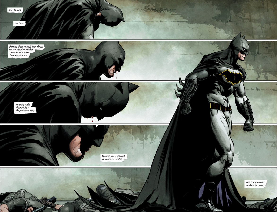 C’est ainsi qu’au cours de Mon Nom est Gotham puis de Mon Nom est Suicide, une réflexion est délicatement menée sur le sens que Batman se donne à lui-même, sur sa redéfinition par les interactions avec Gotham et Gotham Girl tout d’abord, deux tous nouveaux personnages aux super pouvoirs suffisants pour rivaliser avec Superman, puis dans sa relation avec Catwoman, laquelle est rondement menée et ne peut que donner envie de lire Batman : A la Vie à la Mort, récit hors-continuité également composé par Tom King et dans lequel l’auteur raconte l’hypothèse où Batman aurait décidé de s’unir à Catwoman dès le départ. Enfin bref, tout ça pour dire que le fond est franchement intéressant, sans doute plus pour le travail que mène le scénariste sur ses personnages que sur le récit, lequel ne manque cependant pas de qualités comme je l’évoquais plus haut.