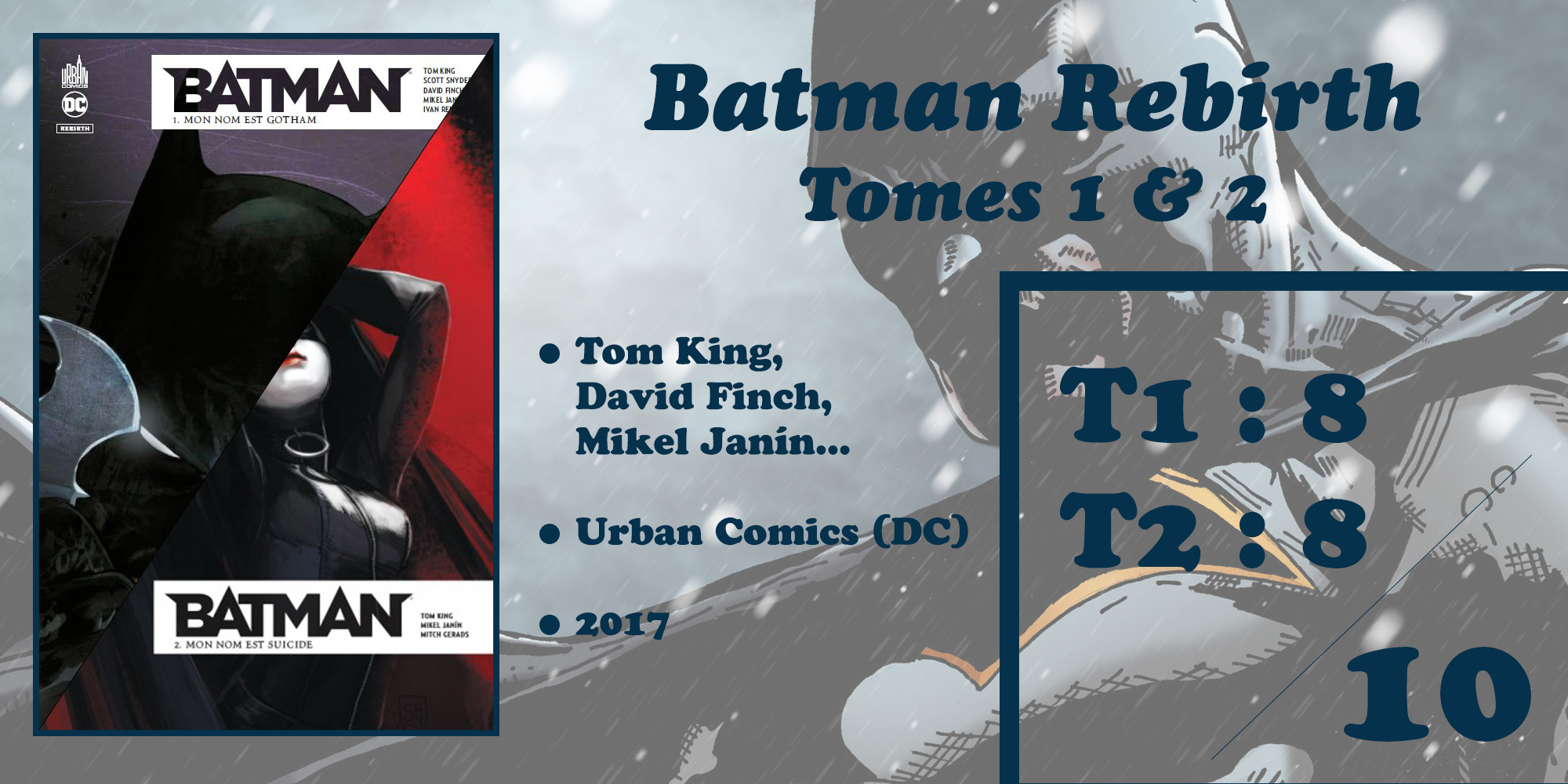 Arrive donc Batman Rebirth et c’est à Tom King que revient la tâche de donner suite aux événements narrés par Snyder avant lui. Les amateurs de comics n’ont plus besoin qu’on leur présente Tom King mais, pour les plus néophytes d’entre nous, sachez que le monsieur a notamment travaillé sur les séries Grayson et Nightwing côté DC Comics, ainsi que sur The Vision pour le compte de Marvel. A ses côtés pour illustrer ces deux premiers tomes, nous retrouvons tout d’abord David Finch, que nous avions déjà évoqué sur ce blog au moment de parler de Batman : Le Chevalier Noir, puis de Mikel Janín, comparse de King sur Grayson notamment mais également présent sur la série Justice League Dark.