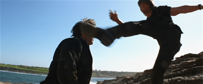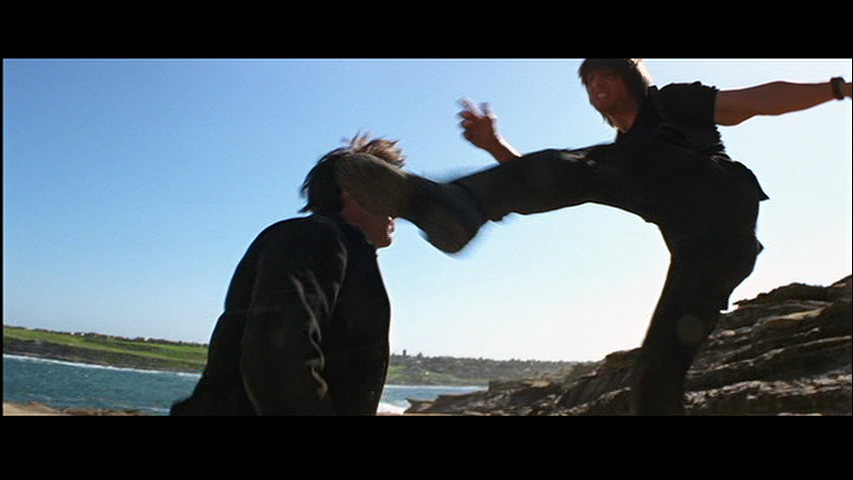 Tout est cliché dans Mission: Impossible 2, sans véritable exception. Mise en scène donc mais aussi chorégraphie des combats, courses poursuites… Rien ne va droit pendant plus de cinq secondes, c’en devient affolant. Comment ne pas lever les yeux au ciel en voyant le niveau de kitsch de certaines séquences (même pour l’époque) ? Je pense notamment à ce face à face en moto entre Hunt et Ambrose où les deux ennemis la jouent à la dégonfle pour mieux se sauter dessus en marche. On pourra aussi ajouter parmi les exemples ce fameux coup de pied dans le flingue caché par le sable d’une plage, permettant de l’envoyer en l’air pour mieux l’attraper à la volée, pivoter et tirer en plein dans le mille… Tout est trop gros, tout le temps.