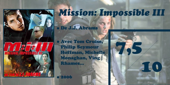 Le pitch : Après des années de service actif, Ethan Hunt (T. Cruise) s’est retiré du terrain et n’officie plus dans la Force Mission Impossible que comme formateur de nouveaux agents. Ainsi, il espère pouvoir mener une vie loin du danger et construire un foyer auprès de sa compagne, Julia (M. Monaghan). Mais la retraite tourne court lorsque Ethan est rappelé par sa hiérarchie pour une mission de la plus haute importance : une de ses recrues, Lindsay Farris (K. Russell), a été enlevée alors qu’elle était en mission pour surveiller Owen Davian (P.S. Hoffman), un dangereux trafiquant et marchand d’armes.