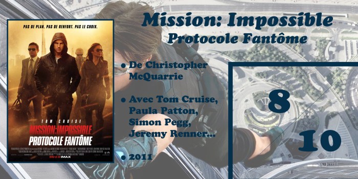 Nous arrivons donc au terme de cette critique qui est au final bien plus longue que ce que j’aurais imaginé ! A ce stade de la rétrospective, Mission: Impossible – Protocole Fantôme s’impose en ce qui me concerne comme ce qui s’est fait de mieux jusqu’alors dans la licence. Habile sur bien des plans, ce quatrième épisode des aventures d’Ethan Hunt et de son équipe réussit à prendre le meilleur de toutes parts et à le mêler au cœur d’un film qui s’impose comme le plus divertissant du lot. Faisant preuve d’une maîtrise louable dans les grandes largeurs, il est simplement dommage que le film n’aille pas au bout de ses idées et perde un peu pied sur la fin. Sans cela, Brad Bird aurait pu prétendre avoir réalisé un chef-d’œuvre du cinéma d’action/espionnage moderne. Mais Protocole Fantôme n’en demeure pas moins un excellent moment vers lequel on reviendra toujours volontiers.