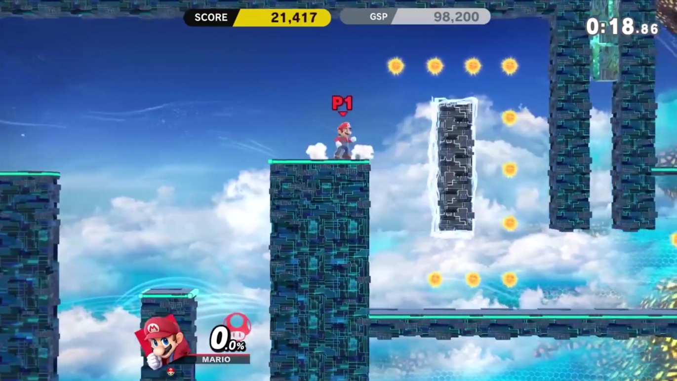 Tout ce que le mode Classique n’arrive pas franchement à faire finalement et s’il a quelques qualités pour lui, elles sont finalement communes à l’ensemble du titre. C’est du solide quoi, avec une finition qu’on ne peut pas nier mais on ne pourra que regretter de voir que c’est sans cesse la même trame qui nous est servie, qu’importe le personnage. Alors oui, la fin n’est pas toujours la même et les combats diffèrent évidemment d’un protagoniste à l’autre mais tout de même, au bout d’une dizaines de runs sur ce mode, on peut difficilement s’enthousiasmer à l’idée de le refaire une soixantaine de fois… Le niveau de plateformes qui ponctue inlassablement le parcours de chaque personnage est symptomatique de la chose : c’est tout le temps le même. Aucune différence, aucun léger changement dans le level design, rien. Cela reprend finalement l’idée de Super Smash Bros. premier du nom, où le mode Classique proposait strictement la même chose. A l’époque cependant, sans doute rechignais-je moins parce qu’il n’y avait au final que 12 personnages mais le fait est selon moi qu’aussi ambitieux que puisse être SSBU (à juste titre au final, n’exagérons rien), je ne peux pas m’empêcher de penser que cette absence de variété dans le mode Classique est notable.