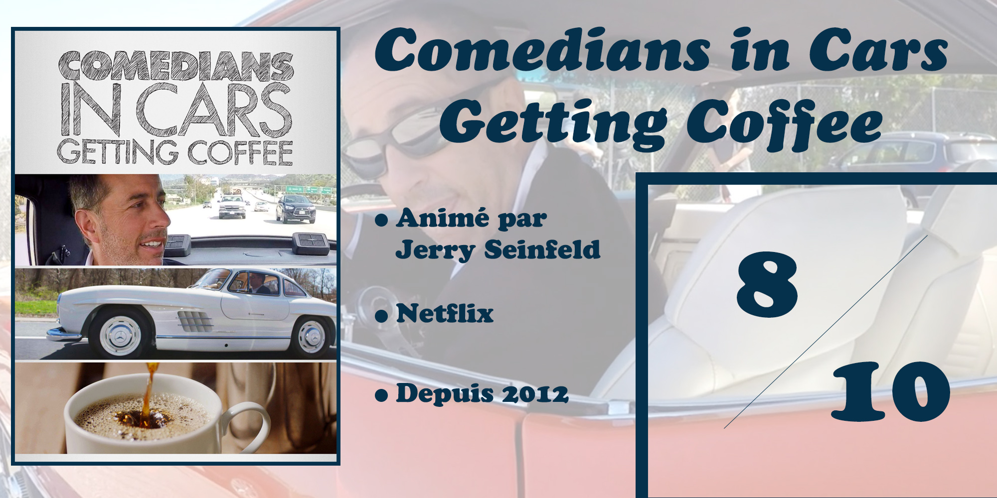 Il y a des choses dans la vie auxquelles on ne s’attend pas. Par exemple, je ne m’attendais pas trop à travailler dans une bibliothèque alors que je suis géographe de formation, tout comme on ne s’attendait pas trop au rapprochement entre Xbox et Nintendo pour faire front commun face à Sony, entre autres choses diverses et variées. Et le fait de devenir fan d’un ersatz de talk show américain où un ancien comédien de stand up ultra célèbre conduit d’autres humoristes dans des voitures classes pour aller boire du café, ça non plus je ne m’y attendais pas. Et pourtant je suis un jour tombé sur Comedians in Cars Getting Coffee, une exclusivité Netflix, et je dévore ça comme des petits speculoos.