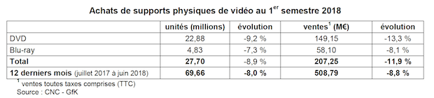 Ici l’évolution des ventes de DVD et Blu-Rays en France pour le 1er semestre 2018.