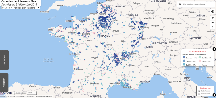 A l’heure actuelle, Google n’a pas fait grand état des nécessités de son service du côté de l’utilisateur. Et si ses data centers sont au cœur de l’attention (on y reviendra après), l’entreprise au gros G se contente pour l’instant de nous dire qu’une connexion de 25Mb/sec serait exigible pour profiter d’un streaming en 1080p/60 fps (soit les performances d’une Xbox One X en gros ou d’un Netflix sous 4K). Et dans l’univers technique actuel, ce genre de puissance ne passe que par une 4G dont le déploiement serait sans aucune encombre ou un abonnement fibre d’entrée de gamme minimum. Et tout cela, ça fait évidemment tiquer beaucoup de monde. La fibre comme la 4G sont encore loin d’être réellement démocratisées et bien des régions de France, d’Europe et du reste du monde en sont encore loin, la preuve en ce qui nous concerne avec cette carte fournie par l’ARCEP (Autorité de Régulation des Communications Electroniques et des Postes) dont l’objet est la couverture du réseau fibre jusqu’au domicile (FttH) en France à date du 31 Décembre 2018 :