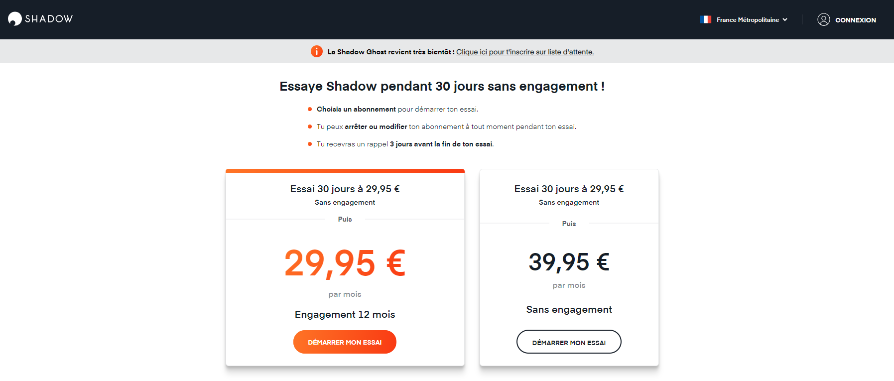Pourquoi ? Parce que le streaming de jeu vidéo a un précédent, même si Google se vend comme un pionnier absolu. Et ce précédent s’appelle Shadow et coûte la modique somme de 29,95€ par mois (avec engagement d’un an), quand on ne paie pas directement 34,95€ par mois (avec un engagement trimestriel cette fois-ci). Difficile en tous cas de donner un pronostic efficace à l’heure actuelle mais il faut prendre en considération la valeur des jeux vidéo aujourd’hui, au neuf comme à l’occasion, et la nécessité pour Google de rendre l’abonnement aussi attractif que possible par rapport au budget moyen d’un joueur/d’une joueuse lambda.