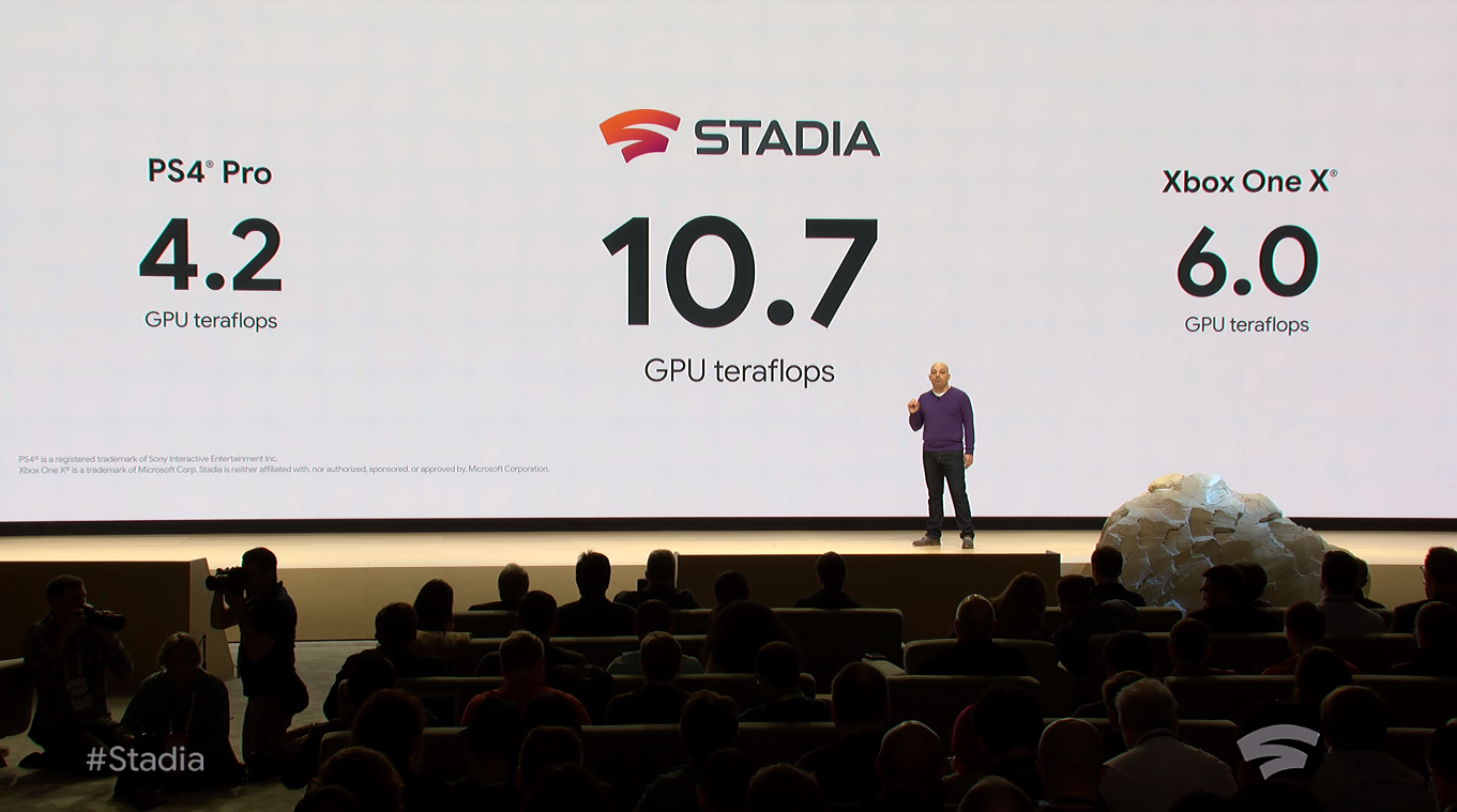 Dans le domaine des promesses en matière de puissance et autre gros fps, Google avance avec des ambitions énormes. La principale, c’est évidemment celle d’une définition toujours plus grande, Stadia devant tourner avec une puissance de pas moins de 10,7 teraflops. Un chiffre qui ne dira peut-être rien à celles et ceux qui ne connaissent pas trop ce vocabulaire (j’en fait partie, j’ai farfouillé pour comprendre de quoi on me parlait) mais, tout ce que je peux vous dire, c’est que ça envoie sévère 10,7 teraflops. C’est suffisant pour balancer du 4K HDR à 60fps a priori et, si on se concentre assez, du 8K dans l’avenir. Pour vous insérer tout cela dans un ordre de grandeur que Google ne s’est pas privé de donner, histoire d’afficher ses petits camarades, la Xbox One X (que Microsoft vend comme la console la plus puissante de touts les temps, etc…) ne tourne « qu’à » 6 teraflops et sa concurrente directe la PS4 Pro à 4,2 teraflops.