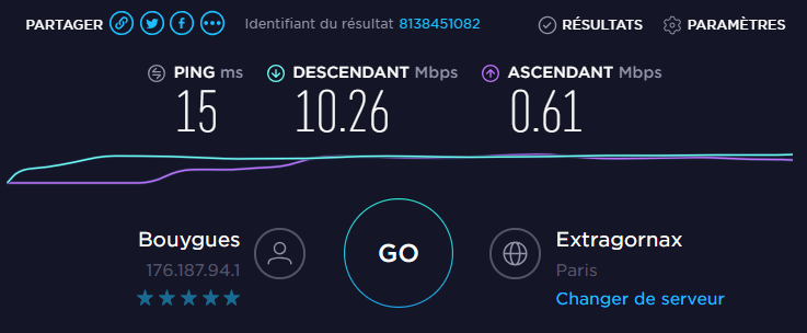 Et cet utilisateur de Twitter ne croit pas si bien dire ! Je suis moi-même abonné ADSL chez Bouygues et, pour le bien de cet article, j’ai réalisé un rapide test de connexion dont voici le résultat :