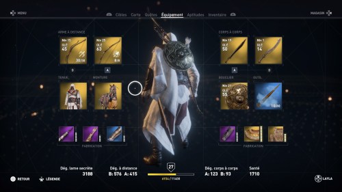 En l’état, Odyssey fait siennes les principales nouveautés apportées à la série par son prédécesseur avec, notamment, la boussole qui remplace la mini-carte ou encore ce gameplay en grande partie revu et corrigé. Sur ce plan, je n’ai d’ailleurs rien à redire. Ces changements étaient déjà appréciables lorsque j’incarnais Bayek alors il n’y a pas de raisons pour qu’il en soit autrement. A cela, on ajoutera également toute la possibilité de personnaliser son équipement, du choix des armes à chaque morceau de la tenue que porte votre personnage. Un point agréable pour qui aime l’inspiration RPG que cela peut donner au titre mais dont je trouve, encore une fois, qu’elle pourrait être mieux utilisée. Hormis le style de jeu que chacun(e) choisira d’adopter, je ne trouve pas vraiment que le fait de passer de telle à épée à telle lance ou telle hache soit réellement un choix déterminant. Je ne vois pas dans les (nombreuses) armes proposées par le jeu de réelle différence en termes d’utilité sur le terrain à partir du moment où l’on sait que le seul fait de grimper de niveaux permet de venir à bout avec une plus ou moins grande facilité de la plupart des ennemis. Un constat rendu encore plus parlant par l’arbre de compétences qui propose de débloquer des actions spéciales redoutablement efficaces pour vaincre des adversaires pourtant valeureux.