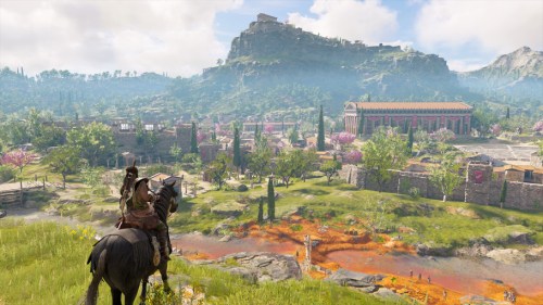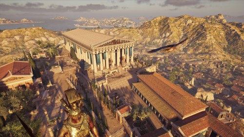 En revanche, on ne pourra nier le côté un peu générique des villes notamment, malgré la beauté que je leur trouve à quasiment toutes. Si quelques unes sortent du lot (en particulier Sparte et Athènes), les autres sont finalement toutes un peu les mêmes, dans le fond comme dans la forme. On me répondra peut-être que « oui mais c’est peut-être parce qu’elles étaient comme ça en vrai ! », ce à quoi je rétorquerais que si tel est le cas et que toutes les villes grecques étaient si semblables, Ubisoft aurait au moins pu varier un tantinet le contenu de chacune d’elles. Evidemment, cela fait beaucoup de zones à distinguer les unes des autres et je n’irai pas jusqu’à demander que chaque ville propose des choses fondamentalement différentes des autres (ou alors on s’appelle Rockstar et on sort le jeu au bout de 10 ans de développement) mais un peu de variété eut été plus que bienvenue. Au lieu de cela, les villes et villages se résument globalement à toujours y faire la même chose : un passage chez le forgeron pour améliorer son attirail, quelques quêtes annexes assez anecdotiques pour la plupart, des objectifs liés à la déchéance du gouverneur local… Que je sois en Phokis, en Béotie, en Mégaris, sur les îles de Naxos ou de Paros ou encore en Crète, je me retrouve en gros à toujours faire la même chose. Ceci, conjoint à leur apparence et leur conception similaire sur énormément de points, confère aux environnements urbains du jeu une généricité un peu tristoune. Ça ne manque pas de vie pourtant, ces espaces étant peuplés de nombreux PNJ en tous genres qui vont et viennent sans cesse, donnant un sentiment de dynamisme dans les cités qui est agréable, mais ce n’est au final que du decorum.