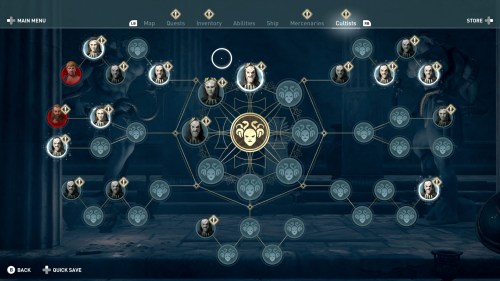 Toutes ces questions de forme mises de côté, reste donc à parler du fond. Et par fond, j’entends évidemment évoquer le scénario de ce jeu. Dans Odyssey, nous incarnons donc comme je l’évoquais plus haut un(e) misthios qui, par la force des choses, va conduire une quête dans le double objectif de retrouver sa famille et de faire tomber un obscur culte secret qui chercher à régner dans l’ombre. La chose, autant le dire de suite, peine réellement à se lancer. Il m’a en effet fallu pas mal de temps avant de commencer à vraiment me sentir investi dans l’affaire et de ne pas subir complètement les dialogues. La faute non seulement au manque d’intérêt assez notable du tout début de l’intrigue mais également à la difficulté que j’ai éprouvée à m’attacher à Kassandra (puisque c’est elle que j’ai choisi d’incarner).