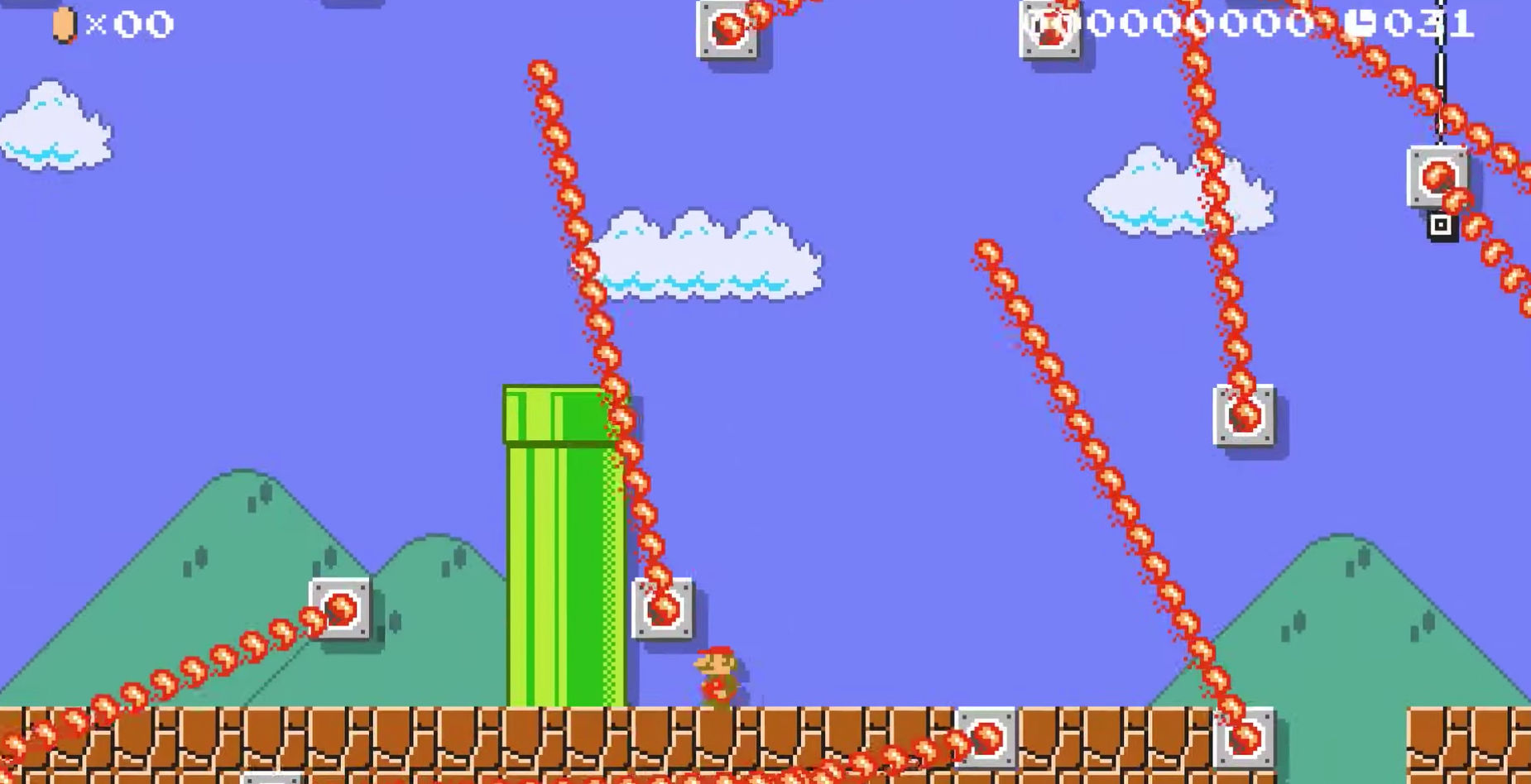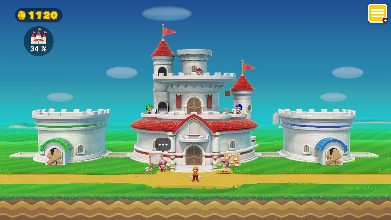 Reprenant grosso modo l’idée sous-jacente du Défi des 10 Mario du premier opus, ce mode propose une centaine de niveaux à parcourir dans le cadre d’un pitch qui se joue comme toujours en quelques mots : alors que les Toads devaient retaper un peu le château de la Princesse Peach, voilà qu’ils le rasent. A Mario donc de remplir les missions proposées pour gagner des pièces et reconstruire ledit château. Tout ceci n’est au final qu’un joli prétexte pour donner un contenu déjà non-négligeable à qui débuterait tout juste sur le jeu et n’aurait pas encore jeté un œil du côté de l’online. De la centaine de niveaux proposés, on aurait bien tort de croire qu’ils vont s’apparenter à du Super Mario classique. Bien au contraire, ce mode histoire ressemble au final bien vite à un véritable exposé des possibilités offertes par l’éditeur de niveau du jeu. Chaque stage permettra de mettre en avant une idée, un concept ou plusieurs afin de montrer aux joueurs et joueuses ce qu’il est possible de faire une fois qu’ils/elles se lanceront dans la création. Laissées entre les mains des équipes de Nintendo, les opportunités du jeu dévoilent tous les fondements, faisant de cette histoire une sorte de tutoriel par la démonstration, vaste, riche et long. Cela donne lieu à des niveaux très originaux, loin du côté un peu conventionnel des Mario en 2D, et bourrés d’intelligence, de sens du level design et d’humour même. On sent en parcourant tous ces stages que l’on s’en est donné à cœur joie pour concevoir tout cela.