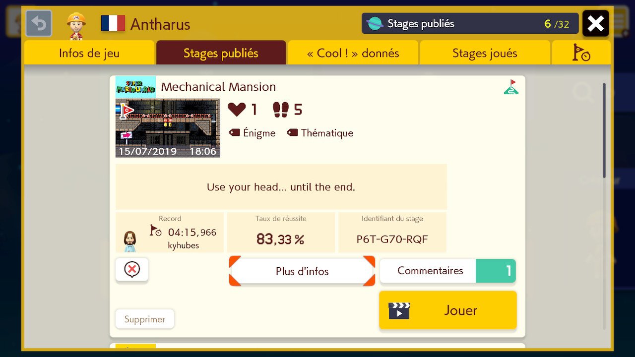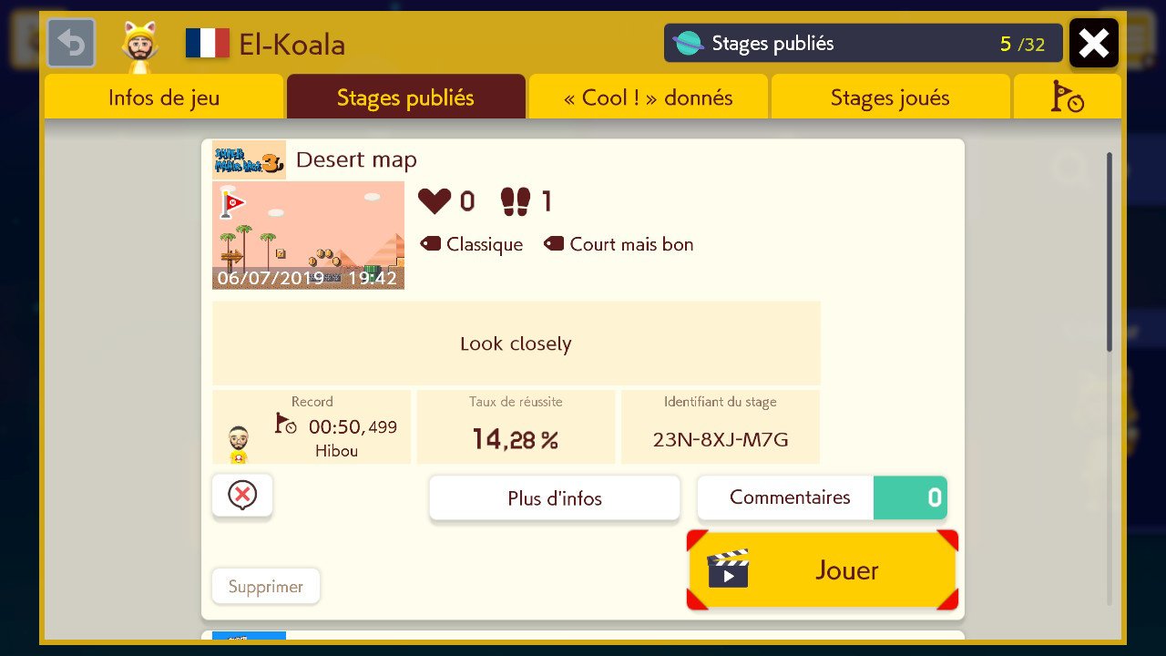 Et tant qu’à faire évoquer un écueil, parlons du système so Nintendo de codes qui régit tout le partage en ligne. Chaque stage se voit en effet attribuer dès sa publication un code à 9 caractères qui permettra de le partager avec qui l’on voudra. Jusque là, rien à redire mais la chose prend une tournure presque désagréable quand on se rend compte qu’il est à 100 % nécessaire d’employer des codes pour retrouver un niveau particulier ou un(e) créateur/trice précis(e) ! Impossible par exemple d’effectuer une recherche par pseudo ou par titre ! Tout cela malgré un outil de recherche avancée qui permet pourtant d’assez bien affiner les critères, hormis les termes de recherche…