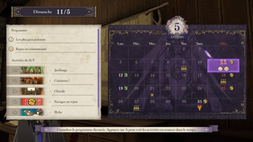 Je ne vais pas dans le détail de tout ce qui est mis à votre disposition afin de ne pas me montrer redondant mais le fait est que ce nouveau système s’avère particulièrement chronophage. A tel point que Three Houses se construit sur une nouvelle temporalité afin de mettre tout cela en place. Ce nouvel opus de Fire Emblem propose en effet une approche mensuelle (fort heureusement calquée sur un calendrier interne et non sur les vrais mois). Au sein de cette nouvelle métrique temporelle, les choses vont grosso modo s’organiser en deux temps : l’un consacré à la bataille de fin du mois, passage obligé pour faire avancer le scénario ; l’autre, plus vaste, s’appliquant sur tout le reste du mois, durant lequel se tiendront les cours (chaque lundi) et sera laissé aux joueurs et joueuses le choix de sélectionner une activité principale pour chaque dimanche parmi quatre proposées : bataille (occasion idéale d’entraîner vos troupes en vue de la fin du mois), séminaire (où vous pouvez faire progresser les compétences de plusieurs élèves, vous compris, d’un seul coup), repos et enfin temps libre. C’est en choisissant cette dernière option que vous aurez tout le loisir de vous livrer aux différentes activités que je mentionnais sommairement plus haut.
