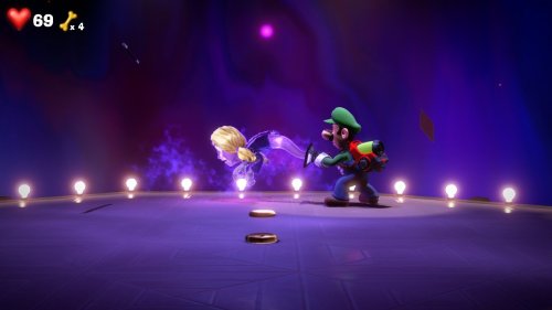 Autre élément de gameplay qui me semble inédit (je n’ai nul souvenir de les avoir déjà vues auparavant), les ventouses que Luigi peut envoyer sur des objets ou ennemis pour venir à bout des uns comme des autres. Vous l’aurez deviné, l’accessoire le plus connu des plombiers sera d’une grande utilité face à certains fantômes bien équipés ou bien pour révéler divers secrets. A part cela, rien de réellement neuf sous le Soleil puisque les autres éléments de jeu de Luigi’s Mansion 3 reposent essentiellement sur l’indéboulonnable Ectoblast, fidèle aspirateur à fantômes créé par le professeur K. Tastroff (lequel est également de retour), ou encore le Révéloscope, inauguré à l’occasion de Luigi’s Mansion 2 et permettant comme son nom l’indique si bien, de révéler des objets invisibles ou (moins évident à deviner cette fois) à extraire de certains tableaux masse de monnaie ou, tout bonnement, les fidèles amis de Luigi faits prisonniers par l’infâme Roi Boo, éternel antagoniste de la licence.