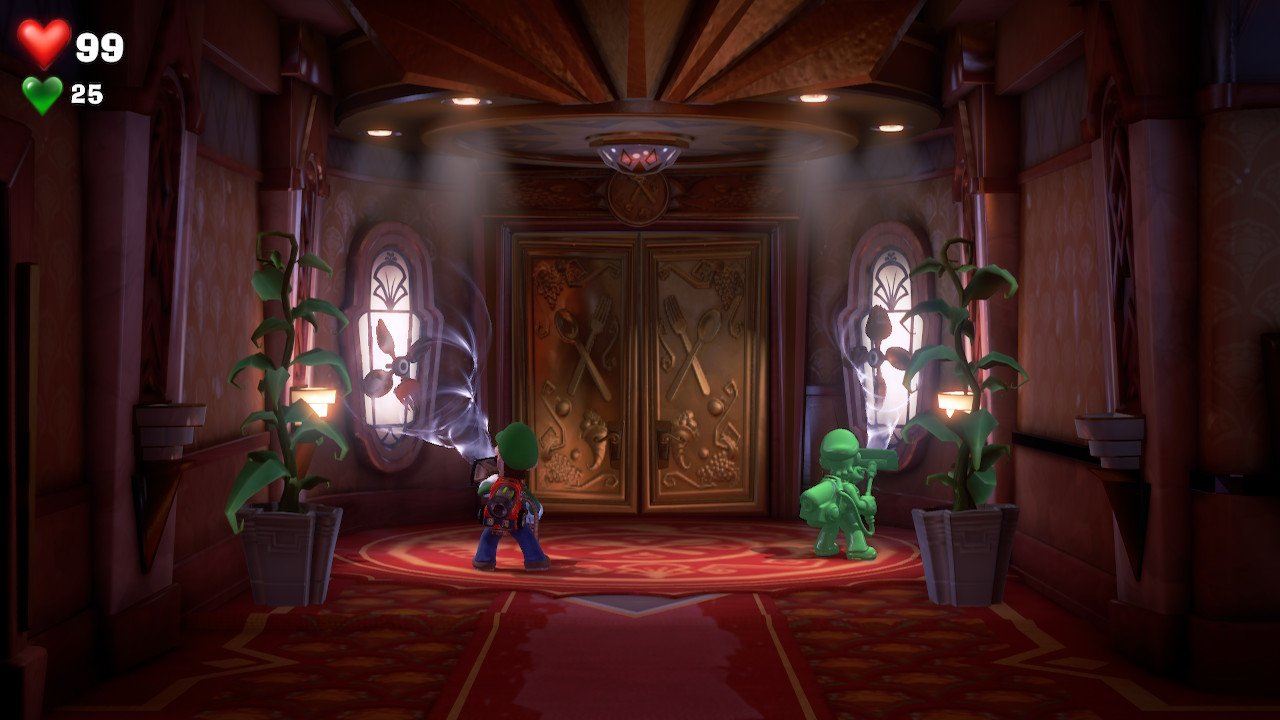 Il ne faut donc pas condamner ce titre avec pour seule justification que son gameplay est réduit mais il vaut bien mieux d’attendre de voir si le point que je viens de souligner juste avant se vérifie. Cela étant, on en viendra vite à penser que le jeu s’avère finalement assez facile, voire très. Avant de préciser tout cela, je tiens à ôter un doute qui pourrait déjà se manifester en vous à ce stade de la lecture : oui, Luigi’s Mansion 3 est un titre plaisant et je peux affirmer que je me suis bien amusé dessus. Ce soft offre dans son ensemble la même expérience que les deux précédents et il va de soi que si vous les aviez appréciés, il n’y a pas vraiment de raison pour que vous n’aimiez pas ce dernier-né de la série. Mais le fait est qu’il est globalement trop facile. Oh bien sûr, quelques « pics » de difficulté ponctuent l’aventure de Luigi dans cet hôtel hanté mais il n’y a jamais de quoi s’arracher les cheveux. Bien entendu, je n’attendais pas ici un jeu particulièrement corsé, cette série n’est absolument pas là pour ça. Mais tout de même, j’aurais espéré être un peu plus mis au défi. Somme toute, Nintendo semble surtout s’être mis en tête de proposer un jeu aussi familial que possible, prompt à être mis entre toutes les mains ou presque et permettant d’obtenir satisfaction immédiate par un seuil de difficulté relativement bas. Quant au challenge… Il existe, certes, mais les joueurs et joueuses un minimum expérimenté(e)s ne s’y retrouveront peut-être pas sur le long terme. Ainsi, les énigmes et autres puzzles dont regorgent abondamment le jeu (et cette abondance est cool) seront au mieux de petits casse-têtes sympathiques mais jamais ô grand jamais n’iront-ils faire appel à un maximum de jugeote. Luigi’s Mansion 3 s’enroule bien confortablement dans ses atours de jeu familial donc et n’ira, hélas, jamais beaucoup plus loin que cela.