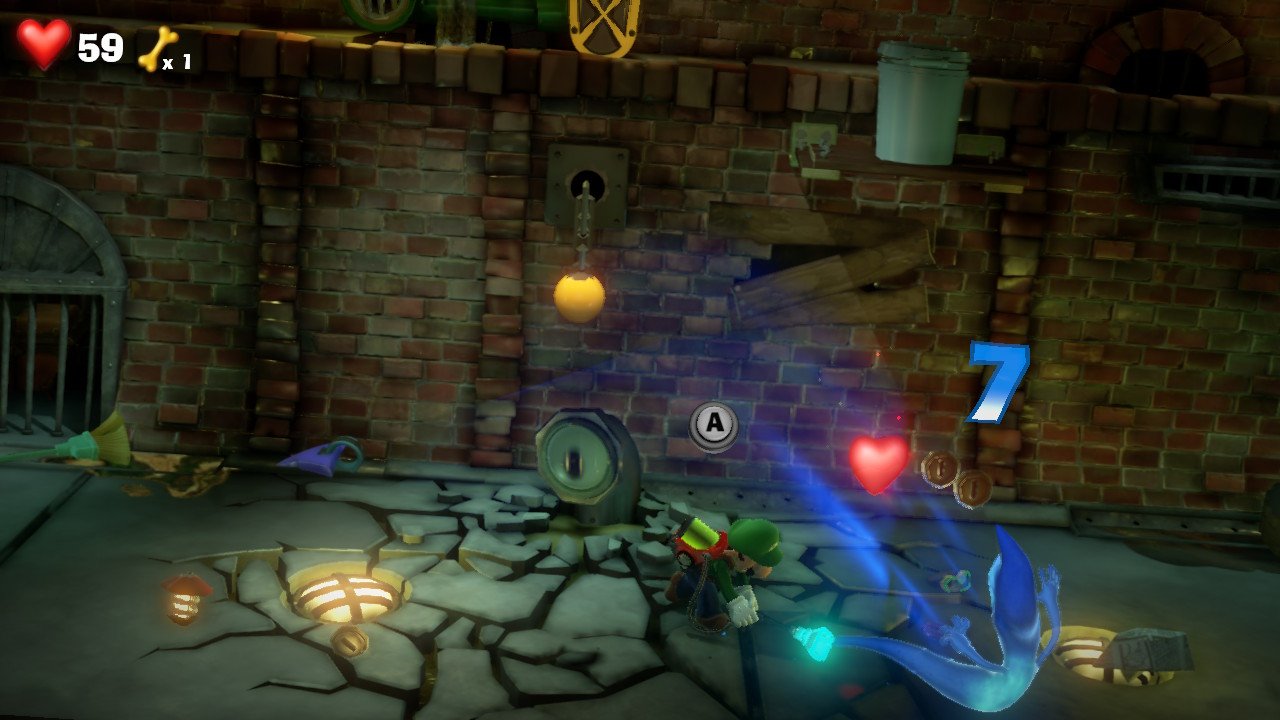 Autre élément de gameplay qui me semble inédit (je n’ai nul souvenir de les avoir déjà vues auparavant), les ventouses que Luigi peut envoyer sur des objets ou ennemis pour venir à bout des uns comme des autres. Vous l’aurez deviné, l’accessoire le plus connu des plombiers sera d’une grande utilité face à certains fantômes bien équipés ou bien pour révéler divers secrets. A part cela, rien de réellement neuf sous le Soleil puisque les autres éléments de jeu de Luigi’s Mansion 3 reposent essentiellement sur l’indéboulonnable Ectoblast, fidèle aspirateur à fantômes créé par le professeur K. Tastroff (lequel est également de retour), ou encore le Révéloscope, inauguré à l’occasion de Luigi’s Mansion 2 et permettant comme son nom l’indique si bien, de révéler des objets invisibles ou (moins évident à deviner cette fois) à extraire de certains tableaux masse de monnaie ou, tout bonnement, les fidèles amis de Luigi faits prisonniers par l’infâme Roi Boo, éternel antagoniste de la licence.