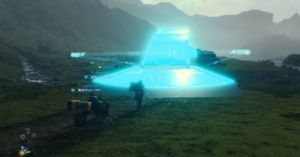 En effet, tout en étant un jeu dénué de mode multijoueur à proprement parler, Death Stranding nous met sans cesse en relation avec les autres propriétaires du titre. Transcendant le concept de réseau chiral qu’il met en scène dans son scénario et qui en constitue une des clés essentielles, le jeu ne va pas nous conduire à seulement reconnecter ses PNJ mais également ses joueurs. A mesure que l’on avance et que l’on étend ledit réseau, c’est au reste des joueurs et joueuses que nous nous connectons plus ou moins directement. L’aire de jeu se métamorphose alors d’autant plus, diverses infrastructures (abris anti-précipitations, échelles et cordes, boites de stockages, tours de guet…) venant fleurir un peu partout, jusqu’aux ponts et routes, véritables métaphores physiques du concept sous-jacent à cette fonctionnalité.