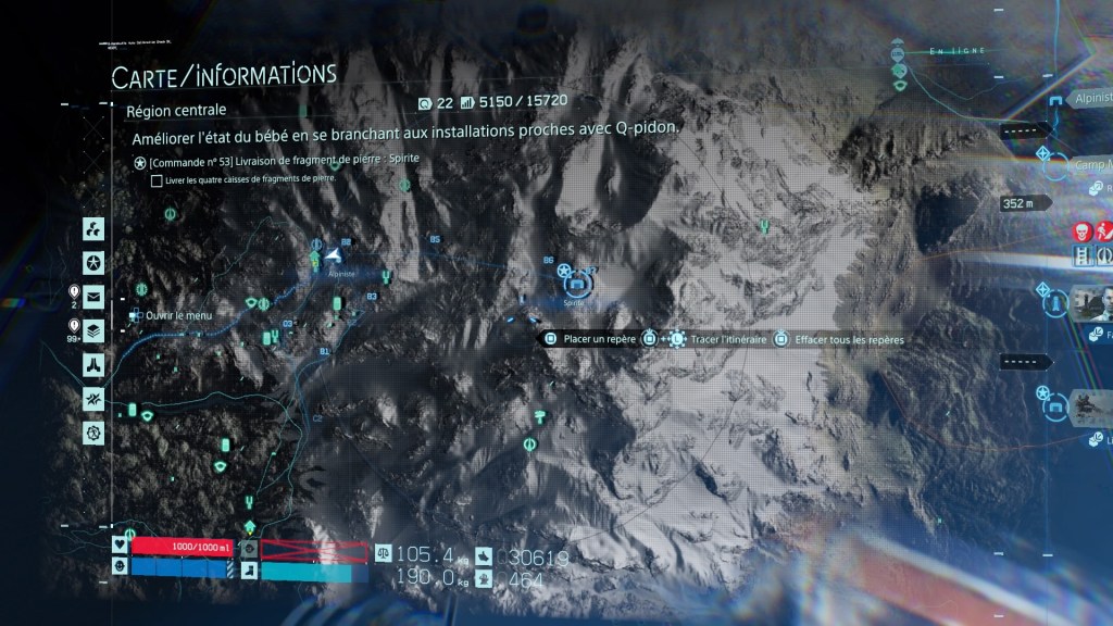 D’une part, cette affection grandissante se fait donc par cette façon qu’a l’open world de Death Stranding de sans cesse répondre aux choix et actions du joueur. Des sentiers se dessinent là où nous passons le plus souvent, des raccourcis se construisent grâce à nos propres décisions et aux équipements que nous aurons utilisés et laissés derrière nous en vue d’un prochain passage que l’on souhaitera plus aisé… Petit à petit, cette immense aire de jeu se redessine à notre image et cela permet aux joueurs et joueuses, là encore sans tout de suite pouvoir s’en rendre compte, de fabriquer ses propres zones sûres, des espaces ou des axes qui lui deviendront familiers et qui, au sortir d’une région dangereuse ou difficile, deviendront de véritables horizons à atteindre. J’ai souri en retrouvant le sentier qui s’était formé sous mes bottes en certains endroits, en redécouvrant une échelle que j’avais déployée dans une zone escarpée ou au-dessus d’une rivière ou en me souvenant que j’avais planté une corde d’escalade en un certain point d’une falaise que je souhaite dévaler de nouveau. Pour faire simple, la map de Death Stranding ressemble sur de nombreux plans au Hyrule de Breath of the Wild. L’une des différences majeures et déterminante, c’est qu’on nous demande ici beaucoup, beaucoup plus d’implication personnelle dans son exploration. On aime donc ce vide tout simplement parce que l’on peut en faire ce que l’on veut, rendant peu à peu l’expérience de ce monde plus accessible (mais jamais proprement facile), tout cela au prix d’un sentiment de satisfaction gratifiant.