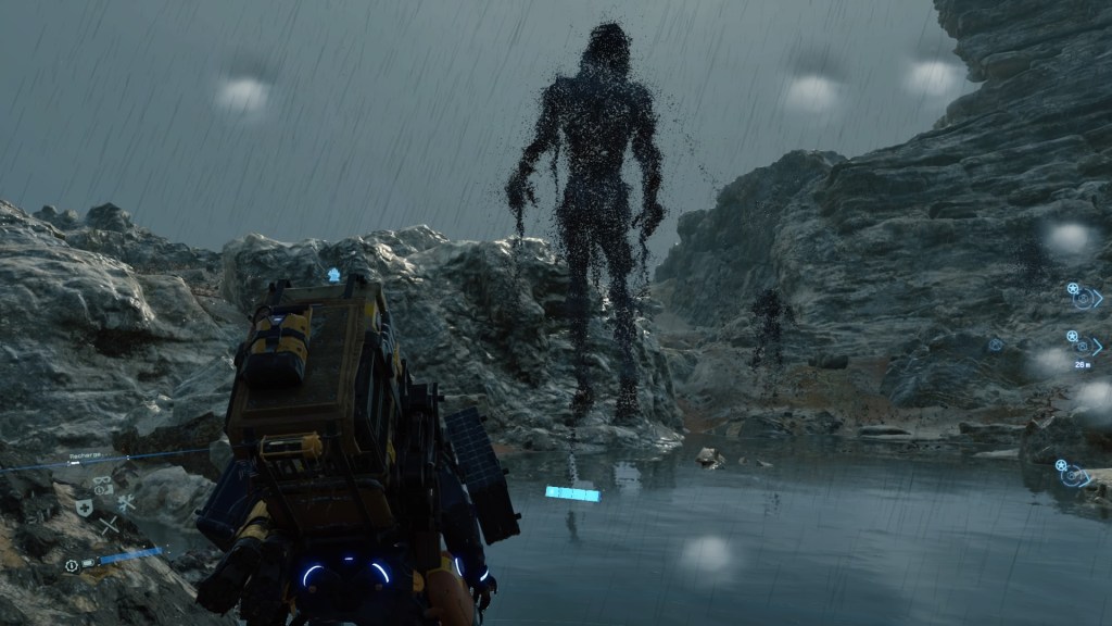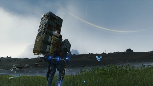 Ensuite, l’amour pour le vide de Death Stranding s’impose aussi par le simple fait que l’apparition de tout autre être que Sam dans les régions qu’l explore est le plus souvent l’annonce d’un danger à venir ou d’un affrontement imminent. Sam lui-même exprime cet état de fait en se parlant à lui-même ou au BB ou bien en sifflotant lorsqu’il se sent bien et qu’aucun danger ne guette. On ne se sent finalement complètement serein dans ces régions désolées que lorsque nous sommes seuls. Par ailleurs, ce point me permet d’aborder un autre aspect : le vide permet de redéfinir la façon dont la peur se ressent. Depuis longtemps, ce sentiment est véhiculé dans les jeux vidéo de différentes manières : jump scares, lieux lugubres explicitement inquiétant, musiques qui se lancent pour souligner le fait qu’on ne va plus rigoler longtemps… Rien de tout cela n’est présent dans Death Stranding et, pourtant, la peur est monnaie courante, pour ne pas dire une fidèle compagne. Seulement, sa manifestation se fait d’une toute autre manière, subtile et douce. Une borne lumineuse que l’on découvre juste avant de passer à côté et l’on se prend à changer de cap : nous sommes près d’un camp de MULEs et nous ne savons pas si nous allons y pénétrer en partant à gauche ou à droite. Un arc en ciel au loin et c’est l’angoisse qui monte doucement : il est synonyme de cette pluie qui détruit à petit feu notre équipement et nos colis tout en annonçant ces Echoués que l’on cherche pourtant à tout prix à éviter.