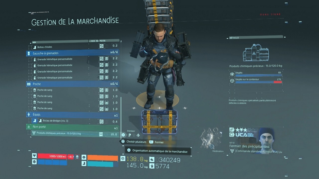 Seulement voilà, le monde ne peut pas rester ainsi sans cadre. C’est en tous cas ce qu’estime fermement Bridges, organisation qui s’est donné pour mission de reconnecter ce qui furent les Etats-Unis dans un nouveau réseau, dit chiral, afin de construire un nouveau pays : les Villes Unies d’Amérique (ou UCA, pour United Cities of America). C’est ici que nous entrons en scène, dans la peau d’un Sam Porter Bridges incarné par Norman Reedus et dont l’implication dans ce vaste chantier se fera en plusieurs temps. Car là où on lui demande avant tout de livrer divers objets et matériaux aux différentes bases du réseau s’ajoute bientôt la nécessité de reconnecter tout ce petit monde mais aussi et surtout de sauver Amélie, de facto nouvelle Présidente des UCA depuis le décès de sa prédécesseuse. Vous noterez que je reste volontiers en surface des choses, mon objectif étant de vous parler de Death Stranding sans trop en révéler quant au scénario. Mon idée est avant tout que le dernier né d’Hideo Kojima est un jeu à vivre plutôt que d’en entendre parler par les autres, un point sur lequel je reviendrai plus tard. Aussi, vous me pardonnerez de volontairement rester un peu flou quant aux tenants et aboutissants du récit.