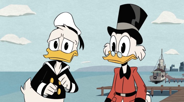 Ce travail passe notamment par une rénovation esthétique qui inscrit très bien cette série dans les canons de son temps, rappelant en particulier une approche du cartoon que des chaînes comme Nickelodeon et Cartoon Network n’auraient certainement pas reniée. Cette mise au goût du jour permet par ailleurs à DuckTales version 2017 de s’offrir une patte bien à elle. Remisant globalement le trait si classique de la série originale au placard et optant pour ce style plus anguleux/carré que l’on retrouve dans nombre de productions télévisuelles animées occidentales depuis les années 2000, cette proposition moderne arrive toutefois à se créer sa propre place en jouissant d’un style qui n’a pas vraiment de semblable dans le microcosme des séries animées Disney d’aujourd’hui. Mais là encore, il n’est pas question d’effacer le passé et si certains personnages voient leur look évoluer (notamment les neveux de Donald), la prise en compte des exercices passés demeure et l’on trouvera dans la charte esthétique proposée ici autant d’influences venues de Carl Barks que de Don Rosa (deux des principaux artistes ayant travaillé sur Picsou et sa bande).