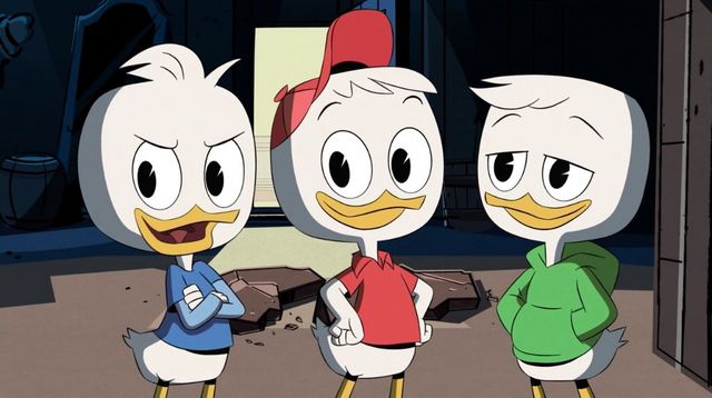 Les personnages mis en scène sont d’ailleurs là pour abonder dans ce sens et je parle ici principalement de ceux que l’on retrouvait déjà dans la première version, qu’ils aient été créés pour elle ou non. Plus encore que nous offrir le plaisir de les retrouver pour de nouvelles péripéties, DuckTales sauce 2017 s’autorise une réécriture de pas mal d’aspects en termes de caractérisation, là encore pour moderniser l’ensemble sans trahir le matériau d’origine. Ce travail de remise à plat, on le retrouve chez pas mal de protagonistes mais il me paraît le plus flagrant chez Riri, Fifi et Loulou. Les caractères de chacun des trois neveux de Donald sont ici bien plus marqués à mon sens qu’ils ne l’étaient autrefois : là où les canetons arrivaient à se détacher les uns des autres par leurs différentes personnalités mais sans jamais briser ce lien qui se retrouvait symboliquement dans leurs vêtements (vêtements identiques, sauf dans la couleur), ils apparaissent ici toujours aussi liés dans leur fraternité mais désormais bien plus aptes à s’affranchir individuellement.