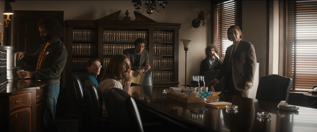 Semblant vouloir composer son film un peu à la manière des plus récentes œuvres d’Adam McKay (The Big Short, Vice, mais sans les séquences face caméra où l’on s’adresse directement aux spectateurs), Aaron Sorkin tente de créer une dynamique où le passé et le présent se mêlent constamment, histoire de bien insister sur la concordance des différents événements et discours et de donner à l’ensemble une rythmique qui viendrait sans discontinuer ou presque souligner l’urgence de la situation et toute l’énergie qu’un procès pareil exige. Evidemment, cela porte ses fruits dans la plupart des occasions mais on y trouvera quand même quelques écueils bien malheureux qui, fort heureusement, sont suffisamment ponctuels pour ne pas entacher l’intégralité du tableau.