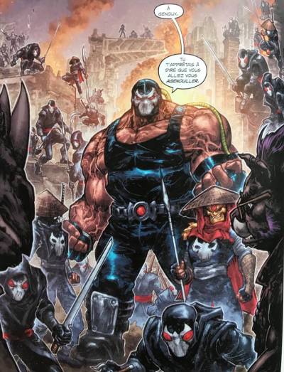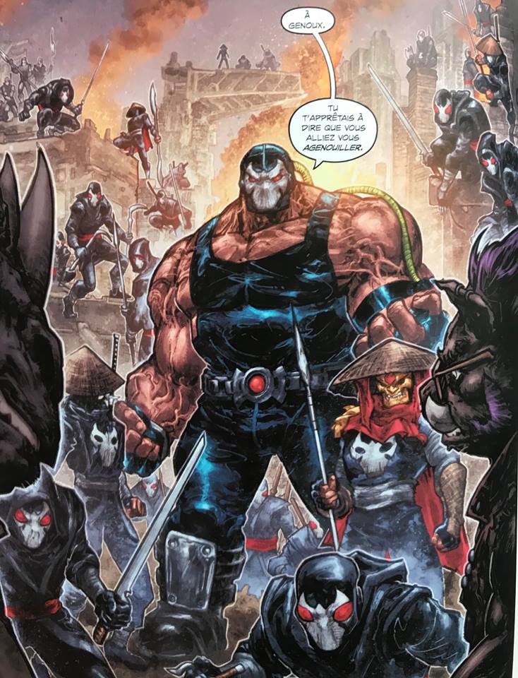 Ce décalage qui se crée et qui se mue tout au long du récit, se tord à la faveur des alliances et des péripéties, c’est aussi le moyen que Tynion a trouvé pour permettre de prendre un certain recul sur les vieilles mécaniques qui régissent les rapports entre personnages dans ces deux univers mythiques. Un Raphaël ou un Léonardo n’aborde ainsi pas du tout un Bane de la même manière que Batman l’a toujours fait, tout comme celui-ci ne voit pas forcément en Shredder la même menace que les Tortues. Les conceptions de ce qui fait l’antagonisme dans Batman et dans Les Tortues Ninja se tord alors à son tour et donne à voir les choses sous un nouvel angle. Oh bien entendu on n’est pas du tout dans une révolution des philosophies respectives des deux séries mais cette espèce de mise en contraste qui s’opère est très agréable à lire. Il n’est donc pas question que d’une action débridée ou d’humour pour faire de l’humour : par ce crossover, James Tynion IV ouvre les portes à une réflexion intéressante sur cette vaste galerie de protagonistes. « Ouvre » seulement et l’on regrettera que la série s’achève déjà tant le champ des possibles demande encore à être défriché et exploré sur ce sujet. A défaut d’un travail sur le long terme, on se contentera des pistes proposées au détour de séquences ou de répliques précises et bien senties. Ce n’est déjà pas si mal.