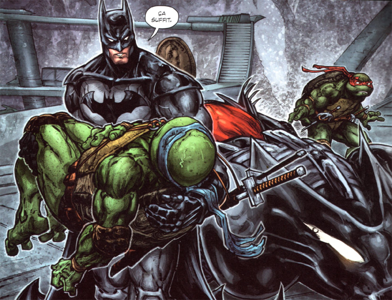 Cela faisait un bout de temps déjà que je n’avais pas pris le temps d’écrire sur un livre. Pas que je ne lise pas, au contraire, j’ai toujours un bouquin à portée de main, mais écrire sur une lecture que je viendrais d’achever n’est pas forcément l’exercice dans lequel je me sens le plus à l’aise. Notez d’ailleurs que j’ai failli vous proposer une bafouille au sujet du Maître du Haut-Château de Philip K. Dick mais, passablement soûlé par ce soporifique ouvrage et peu enclin à chagriner les fans de l’auteur américain, j’ai préféré m’abstenir. Aussi, histoire de se remettre en jambes doucement, nous allons revenir aux bases avec une trilogie de comics qui – une fois n’est pas coutume – met en scène mon super-héros favori : Batman. La différence c’est qu’il est ici accompagné de partenaires de choix en la personne des fameuses Tortues Ninja !