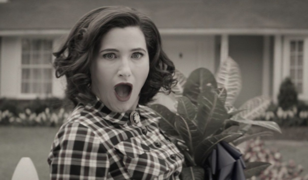 Laborieuse, cette installation de l’intrigue, lente, constitue une des principales difficultés que la série rencontrera pour pleinement captiver d’entrée de jeu. Je nuance volontiers mon propos ici en soulignant que, contrairement à ma nana et moi (ainsi que d’autres camarades avec qui j’en ai discuté), j’ai bien vu que nombre de spectateurs et spectatrices ont été enthousiastes dès le départ, happés par cette aura de mystère qui plane d’un bout à l’autre des premiers épisodes (et qui demeure, d’ailleurs, sur d’autres aspects au plus long cours). Je comprends bien sûr cela, étant moi-même féru des œuvres qui prennent le temps avant de donner les clés de réponse, voire même qui n’en donnent qu’une partie. Ce procédé ne m’a jamais dérangé et, au fond, ne me choque pas tant que ça dans WandaVision. Je précise cela car j’ai le sentiment que ce que je disais juste au-dessus pouvait laisser croire le contraire.