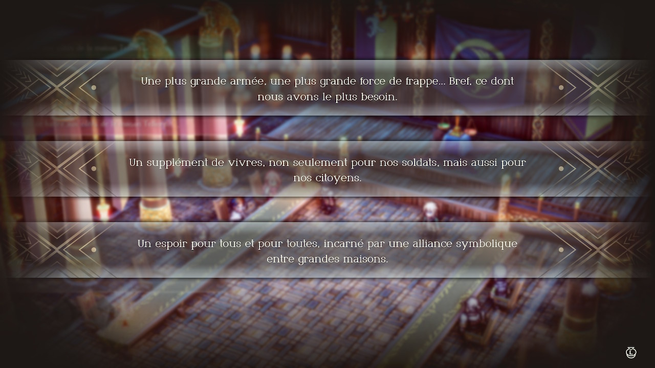 L’intégralité de ce système, en dépit de particularités un peu moins enthousiasmantes, s’avère en tous cas gagnant. Par ce simple procédé, Triangle Strategy réussit à confier à son public un autre rôle, à mettre en balance son rapport à ses personnages et donc à renforcer le sentiment que chacun et chacune développera vis-à-vis d’eux et enfin à densifier une fois de plus ce qu’il a à raconter en nous envoyant à la pêche aux infos. Si l’on pourrait craindre que l’affaire se montre redondante à la longue, il n’en est rien. Cela est dû je pense au fait que le jeu n’abuse pas de ces séquences et les répartit avec un sens certain de l’à-propos dans la partie. Une chance car ces passages amènent fatalement une rupture de rythme qui aurait pu se montrer dommageable si elle s’était produite trop fréquemment.