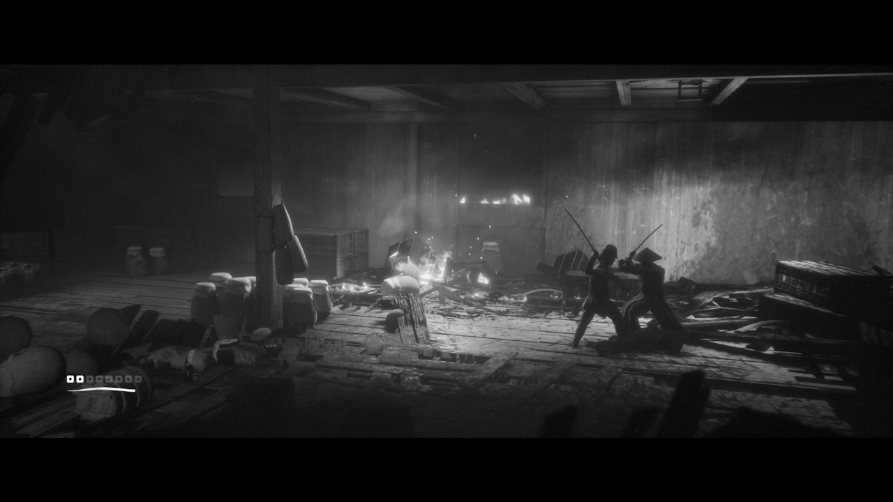 Puisant en particulier ses idées dans des chefs d’œuvres tels que La Forteresse Cachée, Les Sept Samouraïs ou plus particulièrement Yojimbo (connu aussi chez nous comme Le Garde du Corps), le jeu se pare via cette esthétique d’une atmosphère – sinon d’une aura – particulière. La référence à l’œuvre de Kurosawa se porte jusque dans le nom attribué au mentor du personnage que nous incarnons. Prénommé Sanjuro, ce dernier devient alors l’homonyme du protagoniste campé par le fameux Toshirō Mifune dans Yojimbo en 1961 mais également dans Sanjuro l’année suivante.