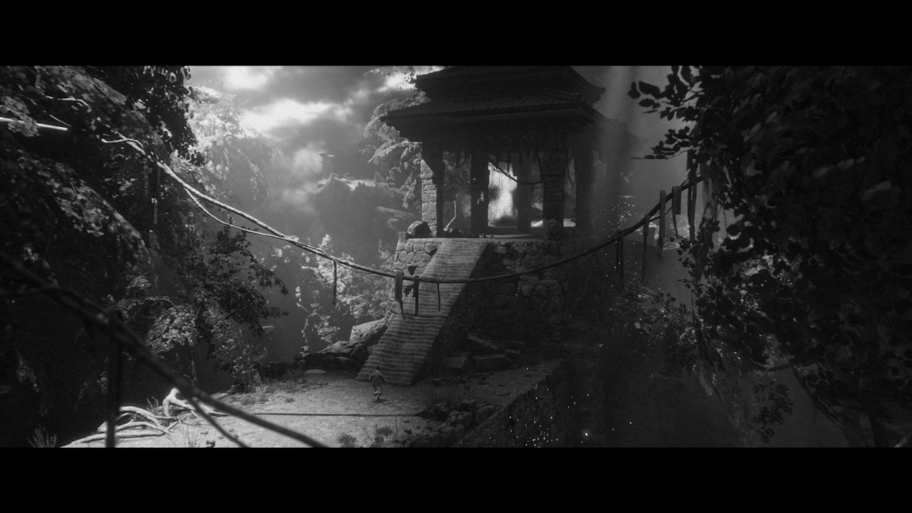 Ce qui est certain avec Trek to Yomi c’est que, d’emblée, il nous colle son aura dans la figure. Pour mon plus grand plaisir, je dois l’admettre, nous voilà à plonger dans une évocation sans détours du cinéma de Kurosawa. Du grain de la pellicule au son qui crépite en passant par la dureté des contrastes du noir et blanc, rien que l’écran-titre et les affichages de logos en amont donnent le ton. Le jeu de Flying Wild Hog et Devolver déroule alors par la suite tout son hommage au cinéma japonais et à celui du maître en question. En cela, il est clair que Trek to Yomi fait preuve de qualités esthétiques qu’on ne saurait lui nier. Que ce soit dans la qualité pure et simple des graphismes ou dans les choix faits en matière de mise en scène ou de composition des plans, le soft jouit d’un travail net sur le visuel qui le rend tout simplement charmant.