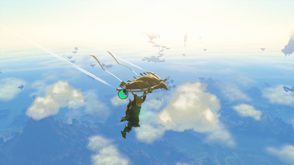 Cette filiation nette entre les deux épisodes s’observe d’abord sur le plan du game design mais aussi sur celui de la narration. Situé quelque temps seulement après les événements de Breath of the Wild, Tears of the Kingdom nous ramène dans l’Hyrule que nous avions laissée. Pansant encore les plaies ouvertes par le retour du Fléau/Ganon, le royaume se relève peu à peu de ces tristes péripéties. Une reconstruction qui s’observe naturellement dans des décors à la fois très familiers et en même temps imprégnés de changements qui relèvent même parfois de l’ordre du détail mais qui nourrissent le lore en évoquant discrètement les évolutions des derniers temps. Comme moyen de renouveler l’intérêt à arpenter cette si vaste région que l’on aurait pu craindre répétitive si nous avions dû de nouveau la retrouver à l’identique, Nintendo a donc choisi tout bonnement de lui imposer une nouvelle catastrophe. Le cataclysme, tel qu’on l’appelle dans le jeu, causera l’ouverture de trous béants dans le sol et l’apparition d’îles survolant la région, tout en causant la disparition pure et simple de la princesse Zelda au cours d’une expédition en compagnie de Link. Voilà pour l’entrée en matière que nous sert Tears of the Kingdom.