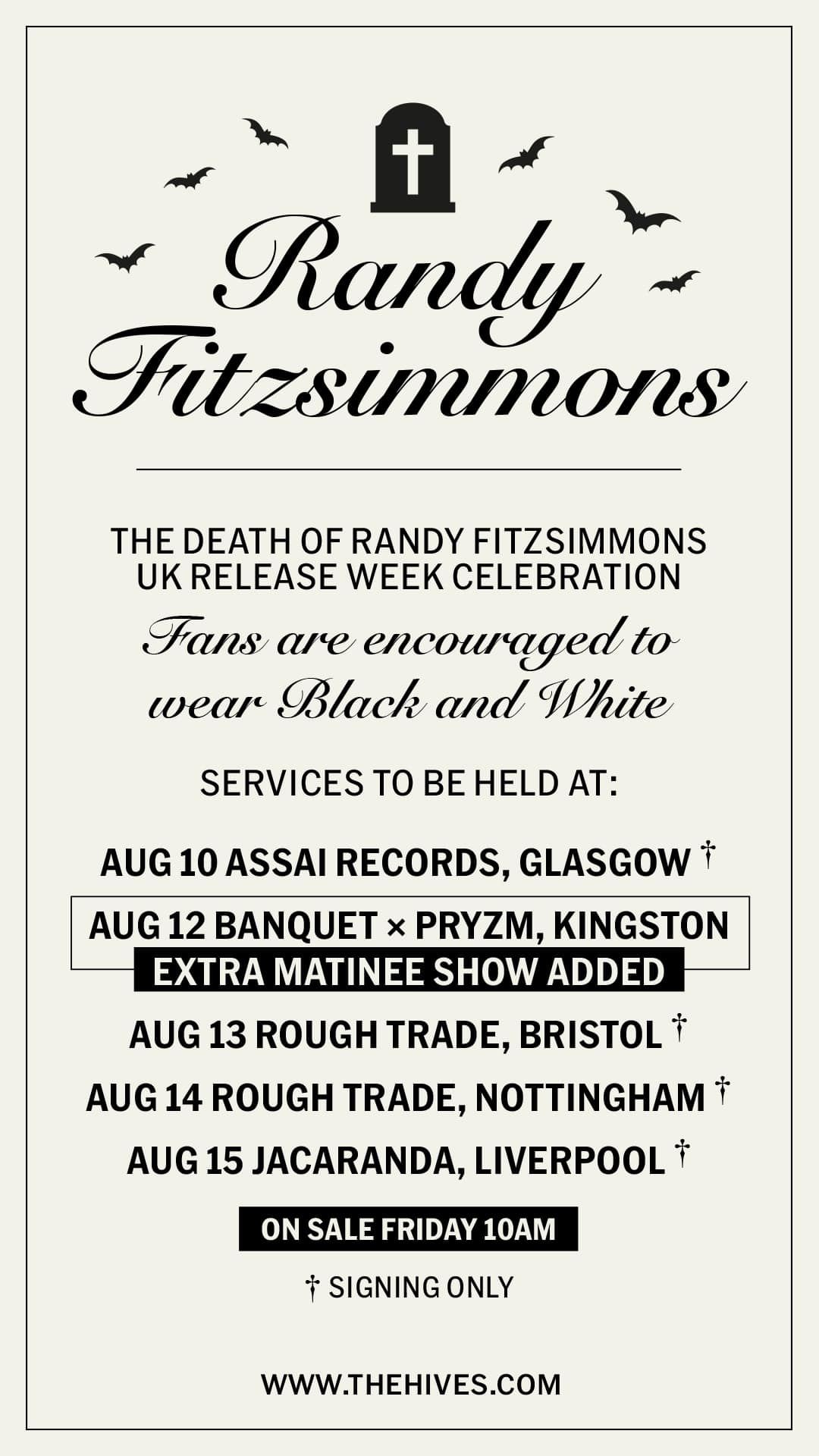 Il en sera de même lorsqu’ils organiseront plus tard une série de « cérémonies » à Randy Fitzsimmons de Glasgow à Liverpool entre les 10 et 15 Août derniers. A travers un faire-part, les Hives invitèrent ainsi les fans à rendre un dernier hommage à cet homme discret dans des tenues en noir et blanc, « car c’est ce que Randy aurait voulu ». Même ici, le groupe fait preuve d’humour en associant plusieurs hashtags du moment à sa publication (#crypto #barbie, #oppenheimer…). Un corbillard sera même affrété pour l’occasion…