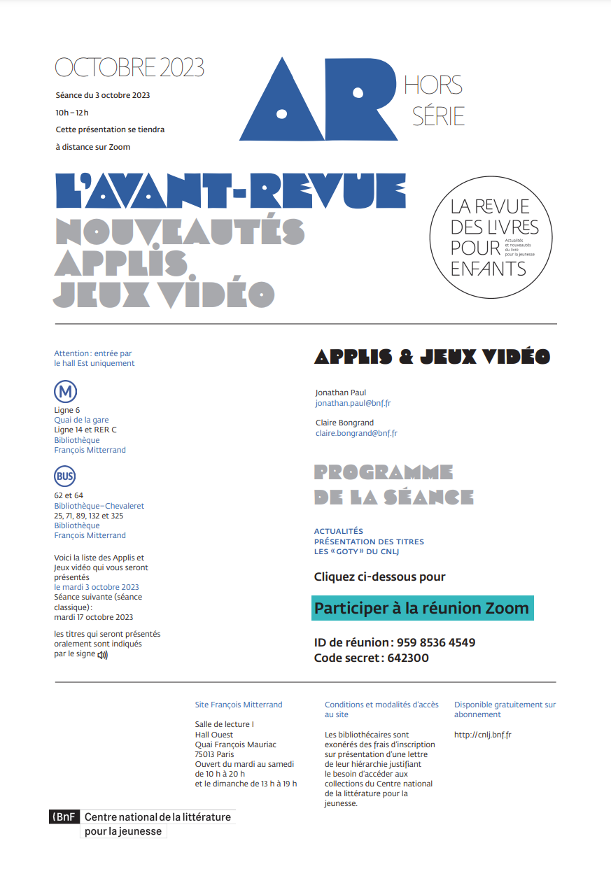 Service gratuit, l’Avant-Revue peut en quelque sorte être vue comme une lettre d’information que le service envoie chaque mois, sur abonnement gratuit. Elle permet alors aux personnes inscrites de recevoir une liste des jeux testés par le CNLJ avec mention de l’âge adéquat pour les découvrir ainsi qu’un avis sur les titres concernés. Mieux encore, l’Avant-Revue fait l’objet d’une présentation assurée par les agents du service sous forme du webinaire. Ouverte à tous, cette présentation se décline deux fois par an (Mars et Octobre) en séances dédiées aux applications et jeux vidéo et au cours desquelles des focus thématiques peuvent également être proposés afin d’envisager le jeu sous des angles spécifiques.